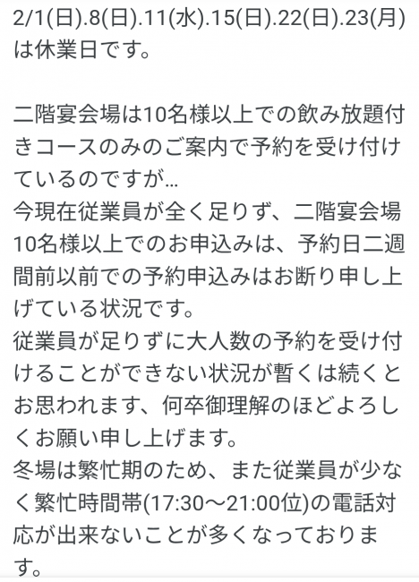 夏季5月〜9月 17:30~22:30お食事L.O.21:30/お飲み物L.O.22:00冬季10月〜4月 17:30~23:00お食事L.O.22:00/お飲み物L.O.22:30